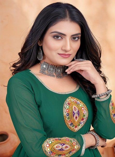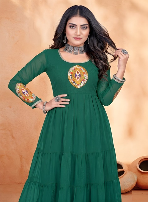 Navratri Special Woman Georgette Embroidered Long Kurta MRP :1 400/- + GST SHIPPING EXTRA Color: Green Top Pattern: Embroidered Top Fabric: Georgette with crepe inner Top Length: Regular Top flared: 3+ MTR Neck : Round neck Sleeve Length: Long sleeve Sleeve style : regular sleeve Belt pattern : Embroidered Stitch: full stitching SIZE Bust: M(38), L(40), XL(42) Top Length: M(48), L(50), XL(50)