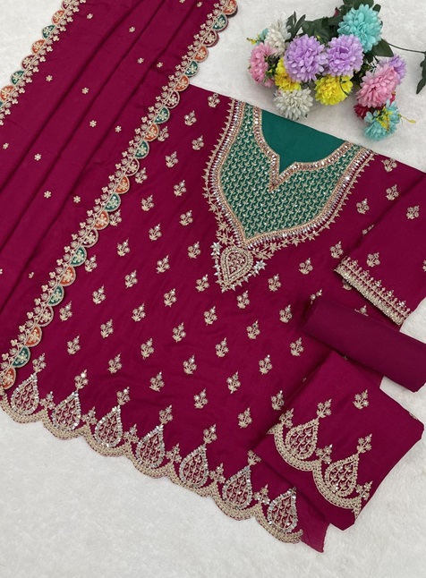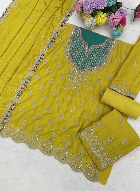 Fabric Details *TOP* :- Airtex Chinon with Embroidery.. sequence work And Mirror Size :- up to 52" Semi length :- up to 35" Inner :- Crepe Silk *PLAZO* :- Heavy Chinon With Heavy Embroidery Work Inner :- Crepe Silk ( cut 2.2mtr) *DUPATTA* :- Heavy Chinon With embroidery Works GST+SHIPPING EXTRA Type :- Semi Stich Weight :- 1.00kg Wash :- first time dry clean 💯%Premium quality available