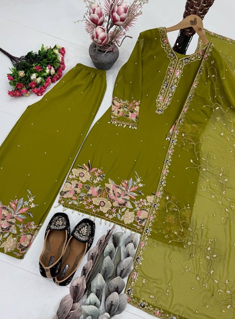 👗FABRICS DETAIL👗 TOP FABRICS : Heavy Fox Georgette TOP WORK : *Heavy Embroidery Sequences Work With Pearl Moti Hand Work And Fancy Lace Border* TOP INNER : Micro cotton TOP LENGTH : 39 Inched PALAZZO FABRICS: Heavy Fox Georgette PALAZZO WORK : Heavy Embroidery Sequences Work With Pearl Moti Hand Work PALAZZO INNER : Micro Cotton PALAZZO LENGTH : 39 Inched PALAZZO SIZE : Full Stitched ( FREE SIZE ) DUPATTA :Heavy Fox Georgette DUPATTA WORK : Heavy Embroidery Sequences Work With Pearl Moti Hand Work DUPATTA SIZE : 2.10-2.20 meter GST SHIPPING EXTRA *WEIGTH : 900GM*